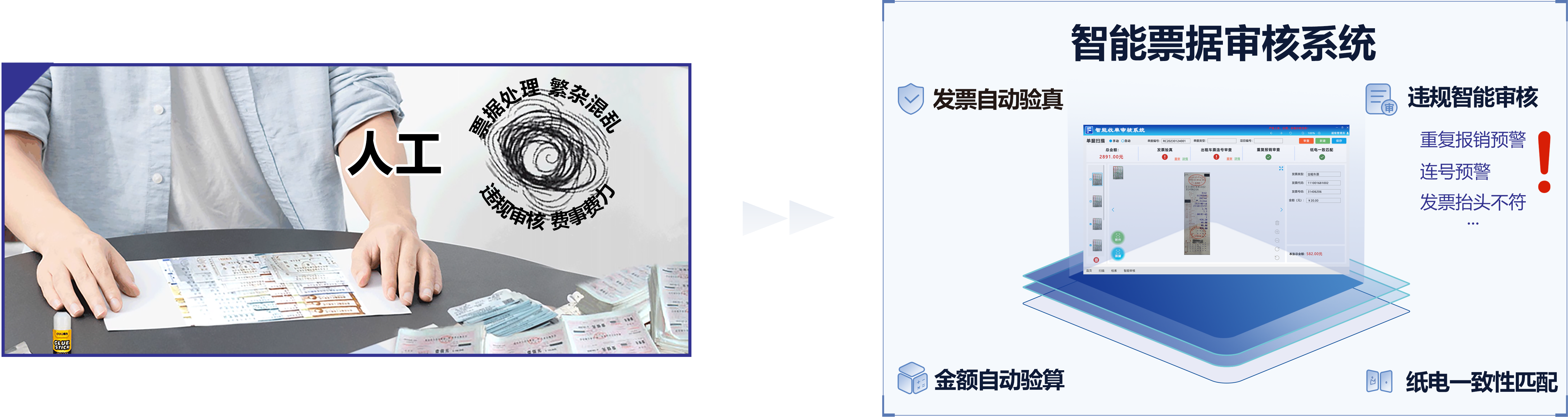 基于领先的智能技术及票务服务能力,研制智能票据审核系统,实现票据智能识别、增值税发票自动验证、金额自动加和,可提供重复报销预警、连号预警、发票抬头不符等违规智能稽核功能,从而将财务人员从费时费力的工票据审核工作中解放出来,助推财务人员向战略管理会计转型。